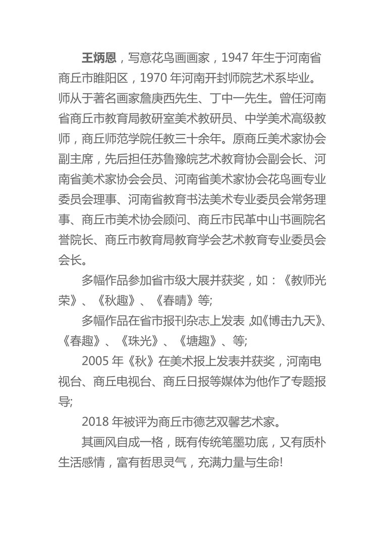 王炳恩,写意花鸟画画家,1947年生于河南省商丘市睢阳区,1970年河南开封师院艺术系毕业。师从于著名画家詹庚西先生、丁中一先生。曾任河南省商丘市教育局教研室美术教研员、中学美术高级教师,商丘师范学院任教三十余年。原商丘美术家协会副主席,先后担任苏鲁豫皖艺术教育协会副会长、河南省美术家协会会员、河南省美术家协会花鸟画专业委员会理事、河南省教育书法美术专业委员会常务理事、商丘市美术协会顾问、商丘市民革中山书画院名誉院长、商丘市教育局教育学会艺术教育专业委员会会长。